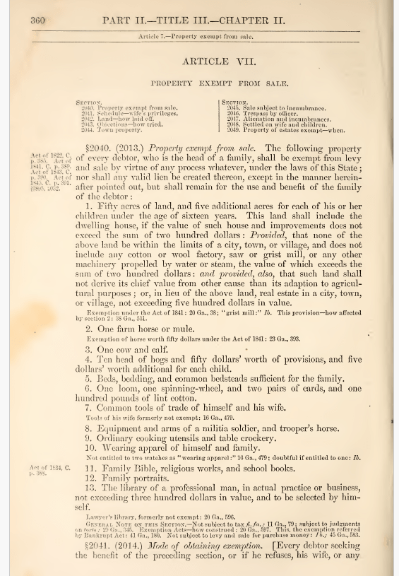 In 1868, the Georgia Legislature enacted Section 2013 of the Code of Georgia (also known as Irwin’s Code), which gave these farmers — at least the ones who had families — a break. They could go to the Court of Ordinary (now known as the probate court) and petition for a homestead exemption, which would exempt “realty and personalty” (land and personal possessions) on an approved list from seizure and sale to pay off debts.