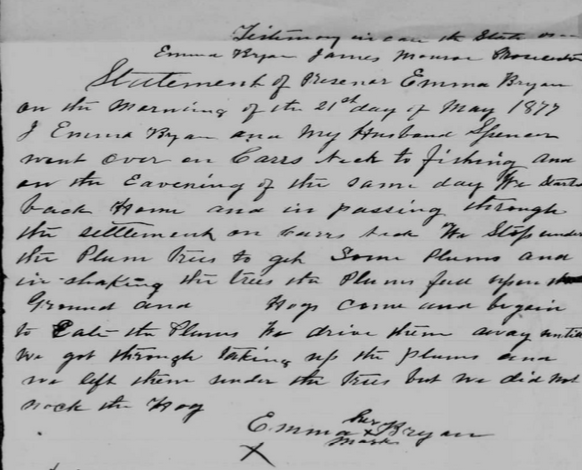 Spencer Bryant ran into a problem in 1877.[6] He and his wife Emma testified that they had gone fishing at Carr’s Neck and on their way home saw some plum trees. They knocked down some plums with a stick to take them home, when some hogs ran in to eat the plums. They drove them off.