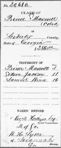 My name is Prince Maxwell. I was born in Liberty County Ga a slave & remained so till the Union army passed through. I am 62 years of age. I reside at North New Port Liberty Co Georgia. I am a farmer. I am the claimant.